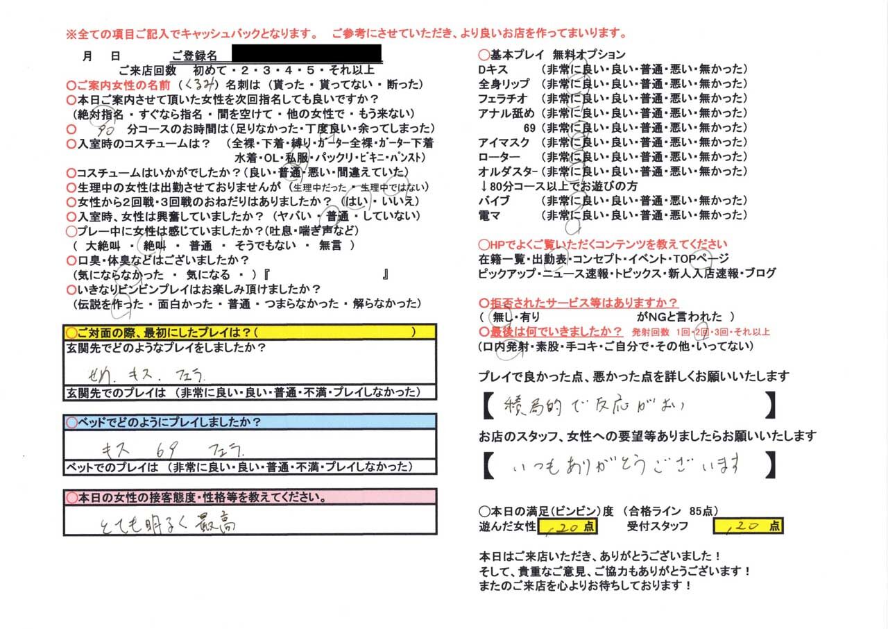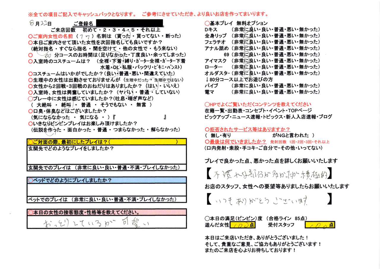 恥ずかしがりな欲しがり女性が入店しましたー☆肌の質感めっちゃGOOD!少しだけ触らせて頂きましたが、スベスベ感やばいっす!!玉のようなつるつるお肌に、勃起したチ○コを擦りつける事の出来る皆様が本当にうらやましいッ!!まぁるく触り応えのあるお尻は、一度揉みしだけば…ヤ・ミ・ツ・キ♪過去の男たちもみーんなこのお尻の魔力に捉われたのでしょうね(笑)褒められ続けたおかげか…腰回りからお尻近辺の感度がかなり高めとか!?お尻も魅力的ですが、おっぱいの形・そして感度が良い!!乳房・乳首ともに感度良好なので…お好きな方はむしゃぶりついてしまって下さいね♪アイマスクは初めての利用でちょっとドキドキしちゃってますが、その興奮がプレイにしっかり現れますのでご安心を!男を喜ばせる事が大好きなの彼女。ローションでぬるっぬるになりながらする男との絡み合いが、一番好きなご様子!まだ使ったことが無い方は、ベッド一面をローションまみれにして遊んでみては!?丹念なご奉仕精神は、おしゃぶりの仕方も違うんです☆男のウィークポイントを反応見ながら変えて…じっくりねっとりしゃぶってくれます♪チ○コが好きな彼女は当然…チ○コを一度握らせたなら…離しません♪