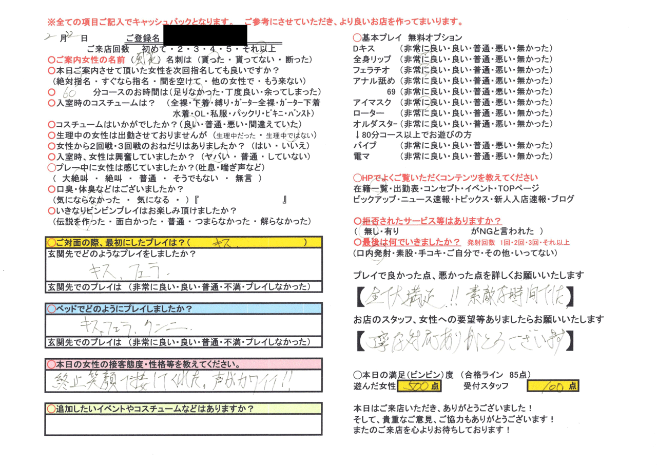 【濃厚なディープキスがしたい】という志望動機で( ̄▽ ̄)♪ 瞳がクリクリっ!八重歯が可愛らしいっ!愛嬌満点気遣い上手のオンナがビンビン伝説の面接にキタ!!面接時から物凄く丁寧で性格の良い子だな〜という印象のオンナ。ですが、中身はもっぱらドスケベ(笑) 性癖が【対面からディープキスをする事】なので、当店のコンセプトとの相性が120%♪キスは何で好きなんですか?と聞いた所…「舌の感覚のみになって…思考が溶けていく感覚が好きで…♥」とドスケベ発言( ̄▽ ̄)ニヤリ ※玄関先から思考を溶けさせちゃいましょうwww※ また、感度も良く!濡れやすいオマ〇コはパイパン!! 優しく触られるとす〜ぐに感じて…電マを当てたらす〜ぐにイキます(笑) 気遣い上手のオンナはやっぱり鉄板!フェラ上手!かなりの確率で過去の男性陣からも上手だね、と褒められる事が多いそうです!!ぜひ♪Dキス大好き・パイパンFカップM女と!玄関先から濃厚プレイをお楽しみくださいm(_ _)m