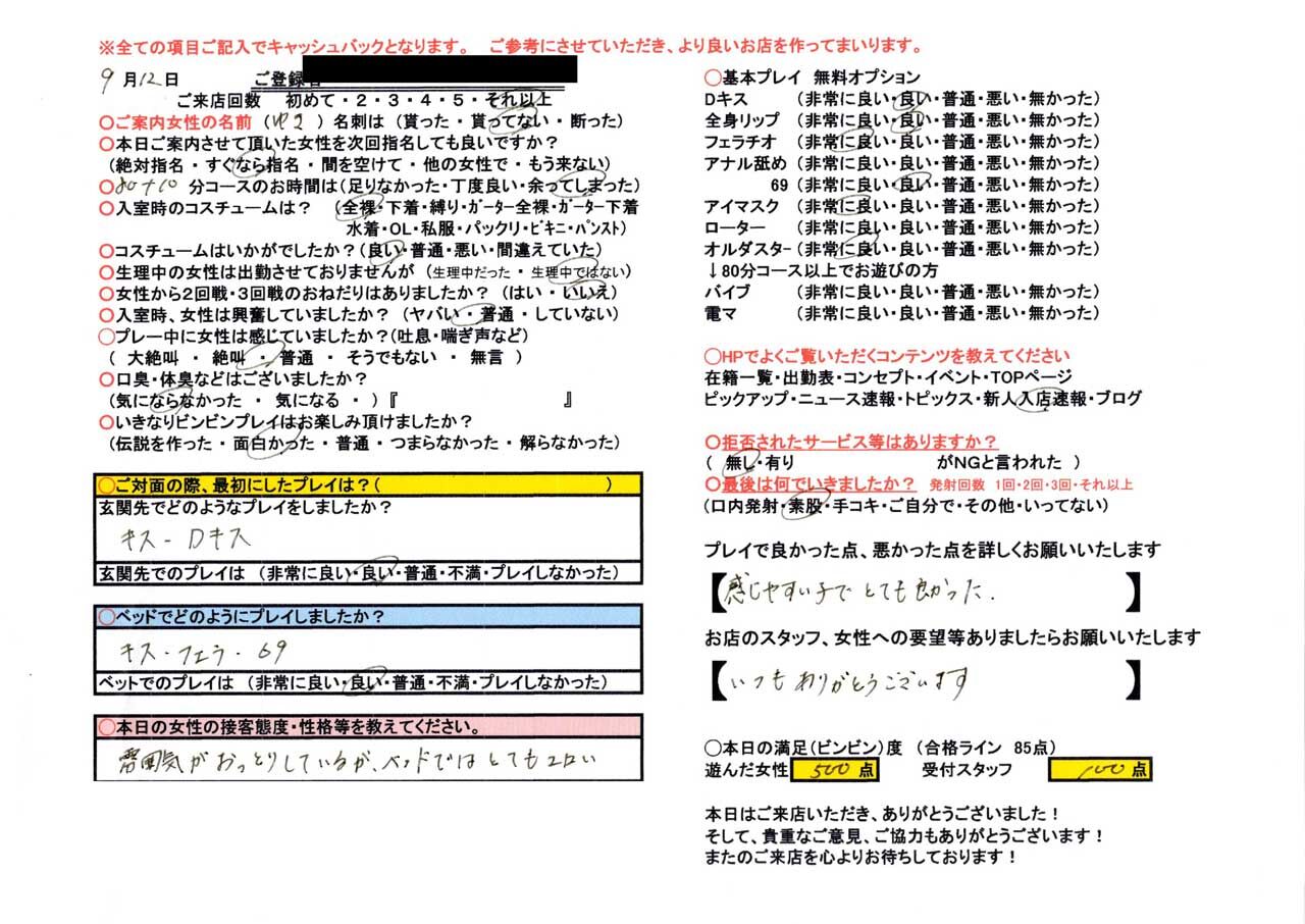 【全身が性感帯のM女!】そして、自他ともに認める”変態”!面接時から「私、変態なんです…♥」と満面の笑みでお答えしてくれる生粋のドスケベなオンナです!! スグに濡れてしまう”敏感体質”でまさかの全身が性感帯♪ とてもイキやすい体質だそうで、責め好きの方との相性は間違いなく抜群!!「こんなに濡れてるじゃん…気持ち良いの?」などの状況説明を”言葉責め”でされると興奮度は2倍!3倍!になってしまいます( ̄▽ ̄)!1番イキやすいのはオマ〇コ全体を舐め回される”クンニ”♪ ビクビクッとカラダを震わせながらイキまくっちゃうそうで、Gスポット直撃に手マンをすると多々『潮吹き』もしてしまう!! 週に2,3回は妄想をしながらオナニーをしてしまい、妄想内容はまさかの「3P」(笑)オチ〇ポが本当に大好きなのが伝わってきます(笑)男性に喜んで貰うのが大好きなので、責める側にも転じられる!! 全力で楽しみながらプレイしちゃう生粋の変態、ドスケベなオンナです♪