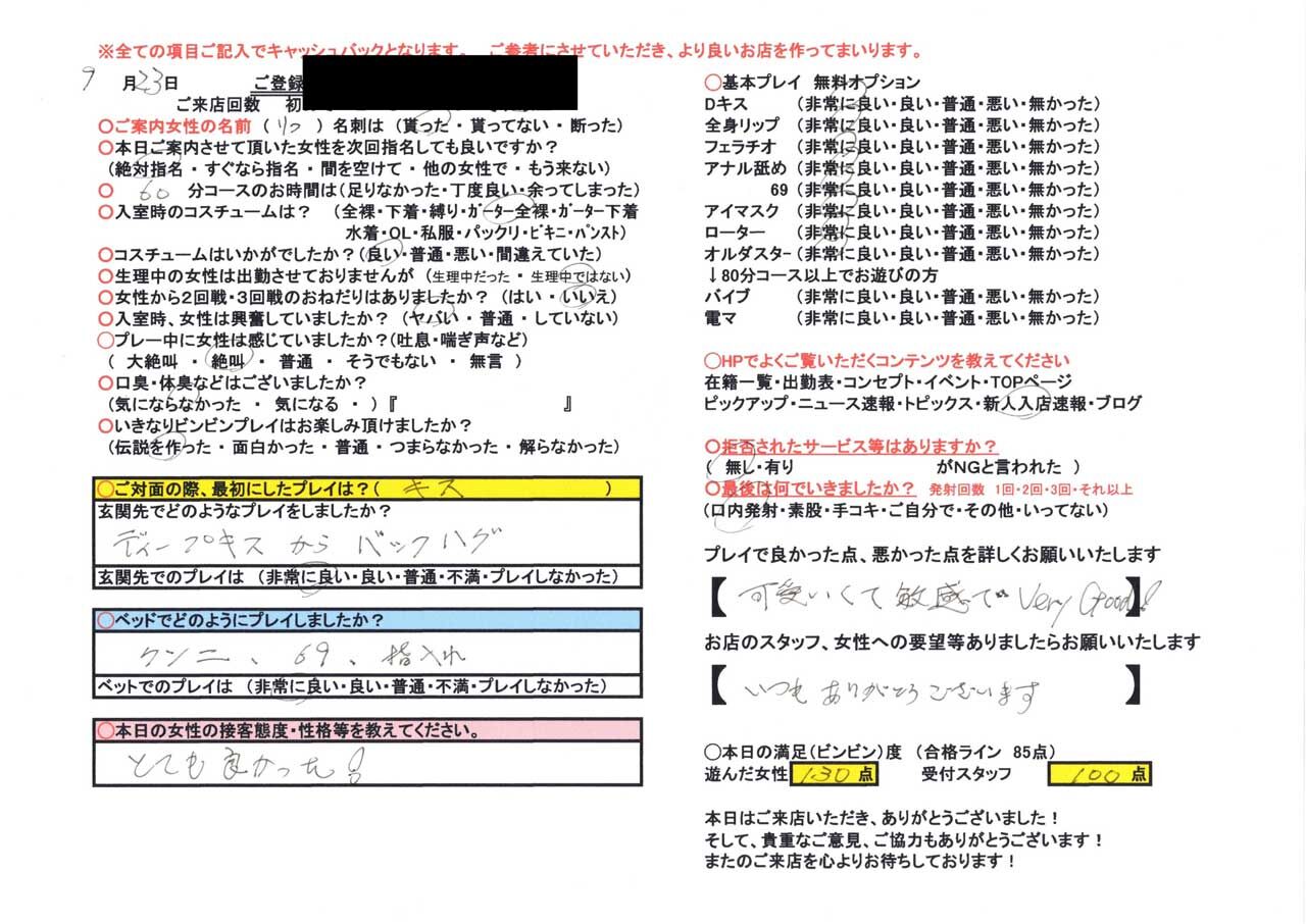 【イラマチオで・・・イキます】スレンダーでスタイル抜群の・・・ドMがビンビンデビュー!!! 話せば話す程止まらない”ドMっぷり”。会員様との相性はビンビンに良いと思います!!(笑) スタイル抜群で清楚系の女性なのですが・・・まさかのドM!イラマチオをされるのも好きでまさかの「喉奥が性感帯」なんです!イラマチオでイッちゃうの!?ヤバすぎます( ̄∀ ̄)ニヤリ さらにこれだけじゃありません!文字通りの「全身リップ」を敢行してしまう従順さもお持ちでして・・・首筋から始まり乳首、脇腹、鼠径部と徐々に下へ下へ。最終的には足指まで舐めちゃうそうです♪←最高すぎ(笑) 「生粋のドM」入店です!!責め好きの方!ご奉仕させたい方!お遊び必須!是非狙ってビンビンになってください♪