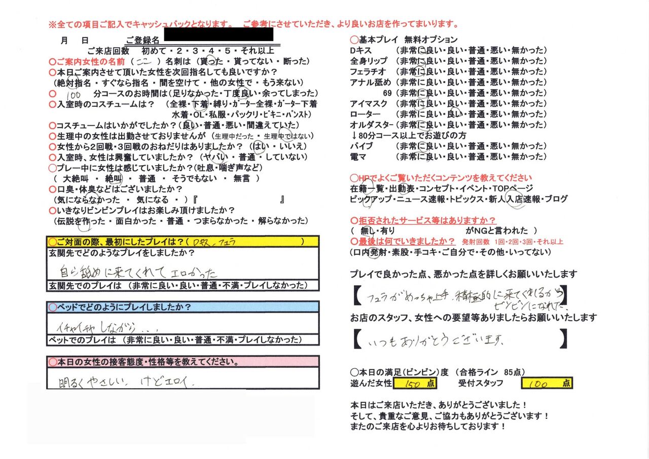 毎日でもエッチしたいッ!!!っと強めの性欲を発揮してくれる・・ビンビン伝説の名物「完全業界未経験」ウブな彼女は・・本気でお客様とエロい事を楽しみたいっと懇願しております♪連日連夜・・寂しくなるとオナニーで性欲解消するオンナが本当に実在した!?都市伝説では、ありません♪ガチ!!!!!なんですwww大人のオモチャが大好きで・・敏感ボディの喘ぎ声は、年中無休でフルスロットル♪綺麗な美巨乳にもビンビンになって頂けます!!非常に人懐っこい性格に・・ドハマリ注意報も発令中!!出勤も少ないので、是非!お目当てのお客様はお早目にご予約になってみて下さい♪抜群のプレイ内容にご納得のビンビン認定を頂ける逸材です♪