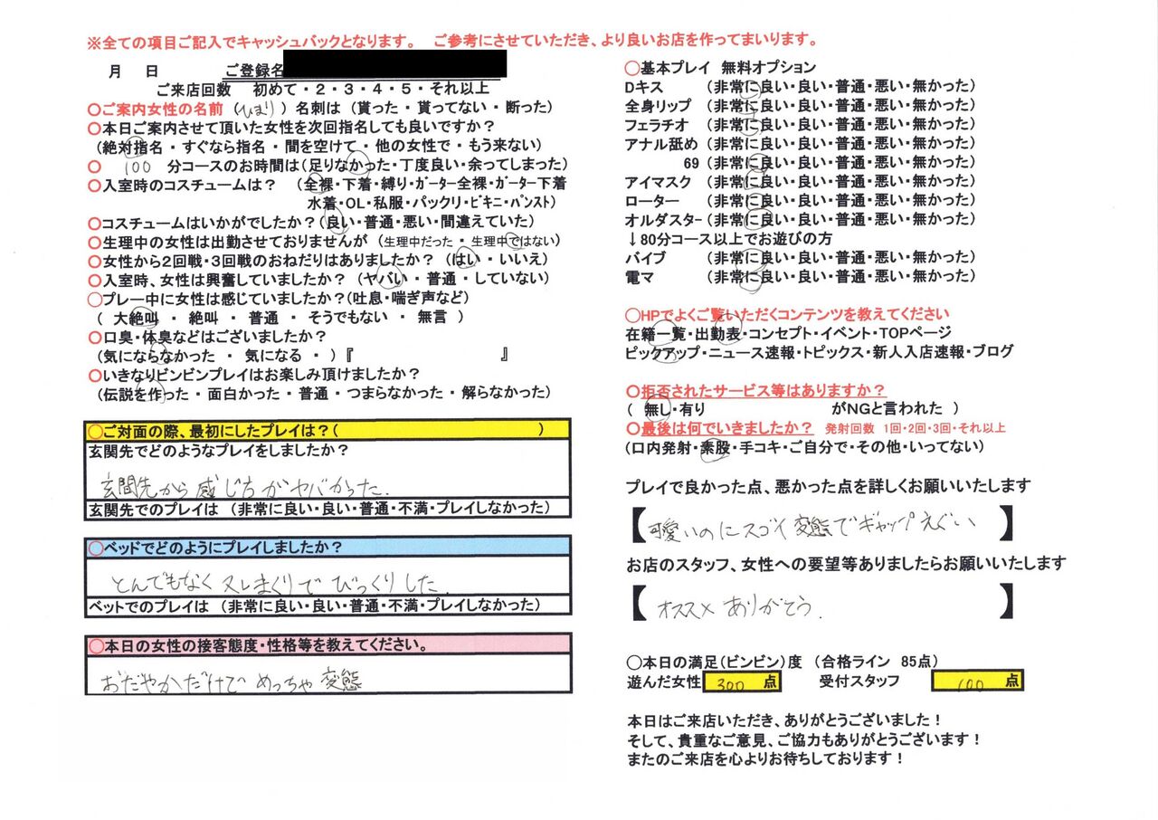 毎日でもエッチしたいッ!!!っと強めの性欲を発揮してくれる・・ビンビン伝説の名物「完全業界未経験」ウブな彼女は・・本気でお客様とエロい事を楽しみたいっと懇願しております♪連日連夜・・寂しくなるとオナニーで性欲解消するオンナが本当に実在した!?都市伝説では、ありません♪ガチ!!!!!なんですwww大人のオモチャが大好きで・・敏感ボディの喘ぎ声は、年中無休でフルスロットル♪綺麗な美巨乳にもビンビンになって頂けます!!非常に人懐っこい性格に・・ドハマリ注意報も発令中!!出勤も少ないので、是非!お目当てのお客様はお早目にご予約になってみて下さい♪抜群のプレイ内容にご納得のビンビン認定を頂ける逸材です♪