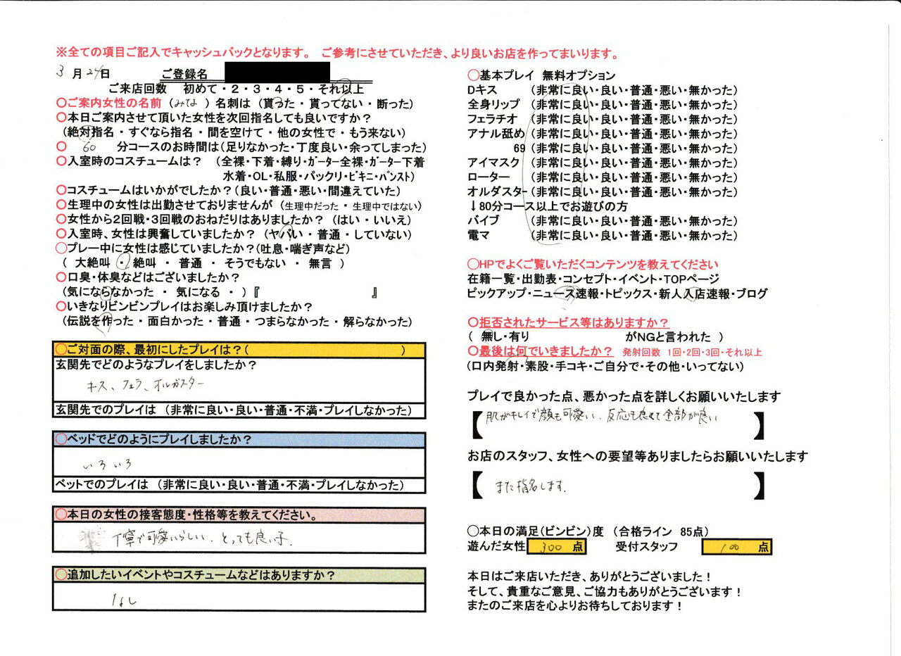 【完全業界未経験】男の要望に忠実なマシュマロボディの従順M女をGET!パートナーに「寝取られ癖」があり・・・彼の前で見知らぬ男と3Pをしちゃうほど男の要望に忠実(笑)ココには書ききれないMエピソードの連続でした( ̄▽ ̄)ニヤリ M度がかなり強い為・・・アイマスク×即プレイのコンセプトに惹かれて自主応募!面接前から、HPを見て股を湿らせていたそうです♪フェラは根元まで咥えてくれるスタイルで、ゆっくりのイラマチオもイケちゃう!!オチ〇ポを咥えている時の支配されている感が性癖なんだとか!?また、パイパンのオマ〇コは「指&舌」でイキやすいらしく・・・!感度もバッチシ!良好でございます!!!抱き心地の良いマシュマロボディ。そして、性的好奇心旺盛な内面性。ぜひ!未経験のM女をビンビン色に!皆様の手で染め上げてください♪
